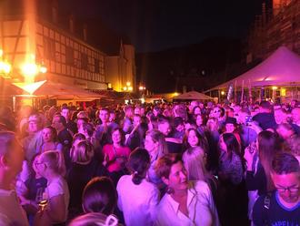 Für den zweiten Abend hatte der Ahrwein e.V. einmal mehr vieles verändert. Jetzt stand keine Band mehr auf der Bühne, sondern ein Discjockey. In Zusammenarbeit mit dem rheinland-pfälzischen Sender RPR1 bat der Speyerer „DJ Robsessed“ zur 80er- und 90er-Jahre-Party. Schnell wurde die imaginäre Tanzfläche immer größer, reichte von der Bühne in der Ecke des Marktplatzes bis hin zum Weinbrunnen. Ein perfekt gestelltes Beschallungssystem sorgte dafür, dass die Lautstärke überall gleich war und nur so weit aufgedreht, dass Gespräche jederzeit möglich waren. Die Lightshow auf der Bühne aber lockte vor eben diese. Und bei den Gassenhauern der beiden verrückten Jahrzehnte sang der ganze Markt lautstark mit, allen voran, wenn die Neue Deutsche Welle angesagt war. „Völlig losgelöst von der Erde“ schallte es am Abend durch die ganze Ahrweiler Altstadt. „Die Stadt lebt wieder“ freute sich Felix Brüggert von den „Jungwinzern The Next Generation“, einem von acht Anbietern der edlen Tropfen, die in der Flasche überwiegend ab 18 Euro erhältlich waren. In den Gläsern der Gäste schimmerten zur Oldie-Party nicht nur hellen Weine. Die in den Jahren vor Pandemie und Flutkatastrophe oftmals bei Weinevents festgestellte Besucherteilung aus Wein interessiertem Publikum tagsüber und Partyvolk am Abend war nur bedingt festzustellen, zumindest meinte Brüggen: „Auch unsere Rotweine werden super angenommen.“ Je später der Abend wurde, desto mehr ließen sich die Gäste Spät- und Frühburgunder eingießen. Die Abkühlung in der Luft tat ihr übriges, um von hellen auf dunkle Weine umzuschwenken. Diese mussten auch gar nicht so sehr temperiert werden. Beim Weingut Lingen sorgte ein Wärmeschrank dafür, dass die Rotweine nur 15 Grad Celsius aufwiesen. Für Peter Lingen war das die absolut richtige Temperatur für Rotwein beim Weinmarkt. Entsprechend gut war auch der Umsatz.