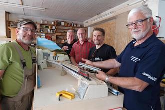 In Dernau wird am Ahrtal im Maßstab 1:87 gebastelt, das Team um den Vorsitzenden Hans-Jürgen Schick (M.) präsentiert die "Baustelle" unterhalb der Saffenburg und verschlammte Züge aus der Katastrophennacht.