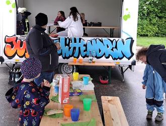 Kinder, Eltern und Großeltern spielen und informieren sich beim Besuch des Mittendrin-Anhängers