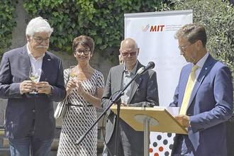 v. l: Elmar Lersch, Petra Schneider, Norbert Lammert und Detlef Odenkirchen bei der Begrüßungsansprache auf der Winzerterrasse der Winzergenossenschaft mayschoss-Altenahr