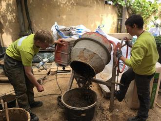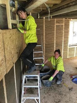 Elena und Afra "erstellen" eine Wand aus Lehm und aus sogenanntem Blähton. Wie sie sagen, werden bei dieser Baustelle in Dernau alte Handwerkstechniken und neue Techniken angewendet.