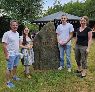 Weinprinzessin Jana Ludwig zu Gast auf dem Pfarrfest. Der Vorstand der Kolpingsfamilie, Martin Müller, Julius Knieps und Anna Steins bedanken sich für ihren Besuch.