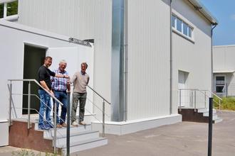 Ralph Stollorz (re.), Schulleiter der Grundschule Dernau, nimmt den Schlüssel für die Sporthalle an der temporären Grundschule Dernau in Marienthal von Jens Brömmel (li.), Kundenbetreuer der Firma Losberger De Boer und Rudi Götz, Mitarbeiter für Fluthilfemaßnahmen der Verbandsgemeinde Altenahr, entgegen.