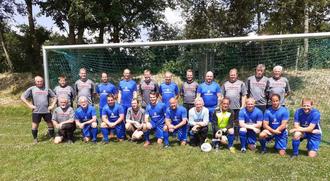 KREUZBERG. Langjährige Aktive bei der Alten Herren Tour in Albersdorf verabschiedet. Auf dem Bild sind die Alten Herren des ESV Kreuzberg (Blaue Trikots) vor dem Freundschaftsspiel gegen die Alten Herren von Alberdorf zu sehen. Mit dem Freundschaftsspiel gegen Alberdorf endete die aktive Spielzeit von Erich Lanzerath und Ernst Großgarten. Die Alten Herren des ESV Kreuzberg bedankten sich bei den beiden für Ihre langjährige vorbildliche Unterstützung mit einem Präsent. Erich Lanzerath für seine Zeit als Abteilungsleiter und Ernst Großgarten für seine Vorstandsarbeit. In gemütlicher Runde endete das Freundschaftstreffen mit Gegrilltem bei Wein und Bier.