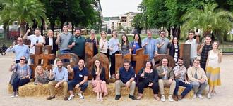 Die Masters of Wine wurden bei der Welcome-Party im Kurpark begrüßt von Ahrwein-Referentin Carolin Groß (hinten 7.v.l.), Winzerin Julia Baltes (hinten 3.v.l.), Winzer und Vorstandsmitglied Lukas Sermann (vorne 4.v.l.), der deutschen Master of Wine Caro Maurer (vorne 2.v.l.) und Nachwuchs-Gastronom Jakob Carnott (vorne r.)