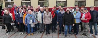 Gut gelaunte Reiseteilnehmer der KERH Kreis Ahrweiler vor der Brockenbahn