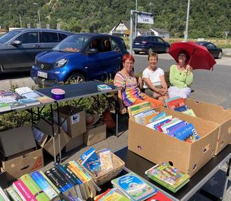 AHRBRÜCK.OC. Am vergangenen Wochenende, 22. und 23. Juli, veranstaltete die katholische öffentliche Bücherei Ahrbrück wieder ihren beliebten Bücherflohmarkt - diesmal nicht an der gewohnten Stelle vor der Pfarrkirche sondern an zentraler Stelle auf dem Parkplatz des örtlichen Supermarktes. Rund 200 Bücher sollten hier pünktlich zum Ferienbeginn gegen eine Spende ihren Besitzer wechseln. Bei anhaltendem Sonnenschein und guter Laune des Büchereiteams nutzten Klein und Groß die Gelegenheit, sich mit Lesestoff für die Ferien einzudecken. Die flutbetroffene Bücherei, die bisher im Backes in Pützfeld ein vorübergehendes Zuhause gefunden hatte, wird nach den Ferien ins Kreucherhaus in Kesseling umziehen. Dort hat sie wieder wöchentlich mittwochs von 17 bis 18.30 Uhr für alle Leser geöffnet. Das Büchereiteam ist auch noch auf der Suche nach personeller Verstärkung und würde sich freuen, wenn sich noch der eine oder andere für die angenehme Aufgabe findet.