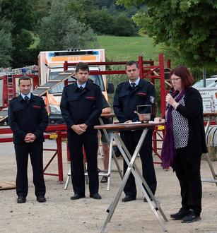 Manuele Kremer-Breuer segnet die Fahrzeuge und das Interimshaus. Im Hintergrund (v. l.): Stellvertretender Wehrführer Martin Marhöfer, Vorstandsmitglied Matthias Knieps und Wehrführer Stephan Knieps