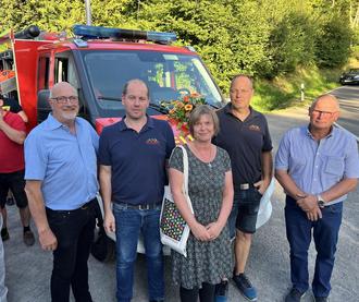 Zufriedene Gesichter bei der Einsegung und Vorstellung des neuen Feuerwehrfahrzeuges in Cassel : (v.l.) der Erste Beigeordnete der VG Altenahr, Jürgen Schwarzmann, der Heckenbacher Wehrführer Paul Schier, Anja Neissner, vom Team Kirche in Heckenbach, der Stellvertretende Wehrführer Dirk Karst und der Ortsbürgermeister von Heckenbach, Heinrich Groß