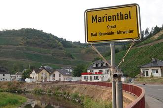 Der von der Flutkatastrophe so stark gezeichnete 100-Seelen-Ort Marienthal ist zur Hälfte zur Kreisstadt als Teil des Ortsbezirks Walporzheim zugehörig, zur Hälfte gehört er zu Dernau in der VG Altenahr. Die Grenze bildet der Hubach. Die Folge: auf der einen Seite werden die Mülltonnen an anderen Tagen geleert, als auf der anderen Seite. Kommunale Abgaben fallen je nach Rathaus unterschiedlich aus und natürlich gibt es auch links andere Ansprechpartner bei den Verwaltungen, als rechts. Immerhin: sollte es einmal brennen, rückt die Feuerwehr aus Dernau an, egal auf welcher Seite. Zudem hat man eine einheitliche Postleitzahl und eine einheitliche Vorwahl. Die Teilung des Dorfes hat historische Gründe: Westlich des Baches herrschten die Saffenburger und Aremberger Herren, links das kurkölnische Ahrweiler.