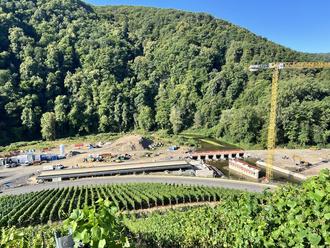 MARIENTHAL. (ang.) Ein nächster großer Bauabschnitt beim Aufbau der Ahrtalbahn steht bevor. Die zusammengeschweißte Stahlbrücke bei Marienthal wird bald über Gleitlager eingeschoben werden. 68 Meter lang ist dieses Brückenelement, das vor Ort von einer Stahlbaufirma aus dem hessischen Darmstadt zusammengeschweißt wurde. In sechs Einzelteilen wurde das jetzige Brückenelement angeliefert.