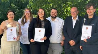 Die frischgebackenen Notfallsanitäterinnen und -sanitäter Doreen Bieber (li.), Antonia Müller (2. v. li.) und Maximilian Speer (re.) bekamen ihre Urkunden bei einer feierlichen Zeremonie in Mainz verliehen. Der stellvertretende DRK-Rettungsdienstleiter Boris Linden (2. v. re.), Praxisanleiterin Tanja Palm (2. v. li.) und Praxisanleiter Simon Barthel (4.v.li.) freuten sich für und mit ihren Schützlingen.