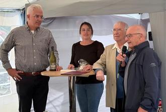 v. l.n.r Verbandsbürgermeister Dominik Gieler, 1. Vorsitzende Eva Hermann, ehem. Lehrer Rolf-Dieter Schmitz, ehem. Schüler Berthold Phiesel