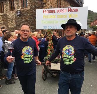 Diese beiden Dernauer weisen auf die Freundschaft zwischen Dernau und Fronhofen hin. Natürlich schenken sie Dernauer Rotwein aus.