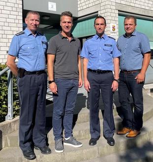 Begrüßung im neuen Amt. V.l.n.r.: Joachim Pinger (Dienststellenleiter), Pascal Rowald (Vorsitzender des örtlichen Personalrats), Andreas Schäfer und Ralf Durben (Leiter der Polizeidirektion Mayen).