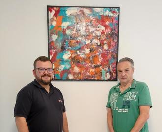 Der Künstler Peter Juchem (r.) stellt derzeit 19 Exponate bei den Maltesern aus, hier mit dem Der stellvertretenden Fluthilfe-Projektleiter, Christian Darantik.