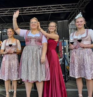 Die scheidende Ortsweinkönigin Laura Nietgen krönt ihre Nachfolgerin Alina Riske. Der neuen Regentin stehen Anna Thiel (li.) und Carla Poppelreuter (r.) als Prinzessinnen zur Seite.