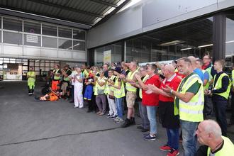 Applaus in Erftstadt: rund 70 Freiwillige empfangen einen Konvoi mit gespendetem Baumaterial aus Bayern im Wert von rund einer Million Euro.