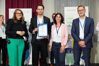 Im Rahmen der Preisverleihung nahmen Pascal Klewe und Tina Busa stellvertretend für die BBS die Auszeichnung im Bereich „Success Story 2023“ von Christina Henke, Staatssekretärin für Bildung des Landes Berlin, und Gernot Stiwitz, Leiter des Pädagogischen Austauschdienstes, entgegen.