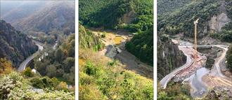 WALPORZHEIM.(kan.) Diese Engstelle an der Ahr bei Walporzheim mit dem Naturdenkmal "Bunte Kuh" zählt zu den besonders markanten Punkten an der Mittelahr. Die Bildercollage zeigt die Entwicklung des Bereiches eindrucksvoll, beginnend mit dem Bild ganz links aus dem Jahr 2014. Das mittlere Bild zeigt die Zerstörung nach der Flutkatastrophe in der Nacht vom 14. auf den 15. Juli 2021. Das Bild rechts zeigt den Fortschritt des Wiederaufbaus der Trasse der Ahrtalbahn im Oktober 2024.