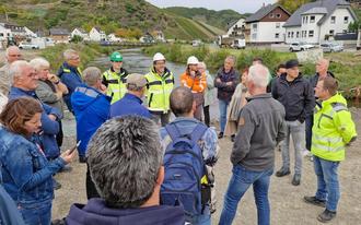 Im Anschluss wurde die sich im Bau befindliche Weinbaubrücke besichtigt. In Abstimmung mit der Baufirma Leonhard Weiss durften die Anwesenden die temporär angelegte Ahr-Überfahrt betreten und den Baufortschritt aus nächster Nähe betrachten. Martin Schell erläuterte die komplexen Abhängigkeiten des Projekts, darunter den geplanten Abbau der THW-Brücke im April 2025 aufgrund der Bauvorhaben der Deutschen Bahn. Jens Heckenbach vom Brückenplanungsbüro plann.ing ergänzte technische Details.