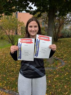 Tabea brachte den 500g schweren Speer auf 26,55 m, was eine neue persönliche Bestleistung (pB) und Platz eins in der Altersklasse bedeutete. Auch mit der 3kg Kugel stellte die 13-Jährige eine neue pB auf und stand ganz oben auf dem Podium.