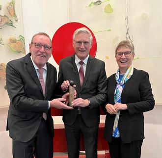 Helmut Schleweis (l.), Präsident des Deutschen Sparkassen- und Giroverbandes, übergibt im Beisein von Beate Läsch-Weber (r.), Präsidentin des Sparkassenverbandes Rheinland-Pfalz, den DAVID an Dieter Zimmermann, stv. Kuratoriumsvorsitzender der SparkassenStiftung „Zukunft Kreis Ahrweiler“.
