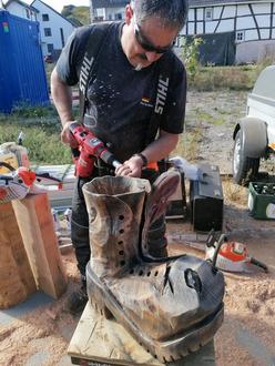 MAYSCHOSS. Ein Wanderrucksack mit Laschen und Ösen, eine pralle Traube und eine wachsam blickende Eule – an einem Stand am Mayschoßer Weinfest veredelten die Kettensägen-Künstler Andy Aßmann, Martin Breunig, Albert Hilligsmann und Olli Schulz filigran Baumstämme. Ihre Mission: Aus Holz außergewöhnliche Skulpturen fürs Ahrtal zu zaubern, die für den guten Zweck verkauft und verlost wurden. Darunter auch eine außergewöhnliche Bank-Tisch-Kombination.