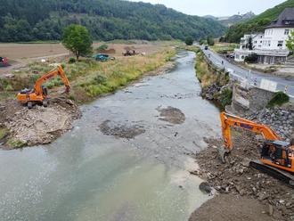 Die verbliebenen Reste der Nepomukbrücke spiegeln sich in der ruhigen Ahr wider. Zu sehen ist ebenso das bekante Restaurant & Weingut Nepomuk, der frühere Recher Winzerverein.