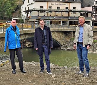 Die Fraktionsvorsitzenden (v.l.) Ulrich van Bebber (FDP), Michael Korden (CDU) und Christoph Schmitt (SPD) sind sich einig: Der Neuaufbau des Ahrtals muss im Kreistag eine höhere Priorität als bisher haben.