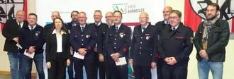 Die geehrten Feuerwehrmitglieder der VG Altenahr mit Landrätin Cornelia Weigand, dem 2. Beigeordneten Markus Noack und den Wehrleitern.