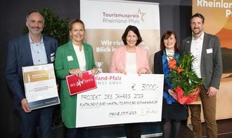 In Mainz nahmen der Vorsitzende des Ahrtal-Tourismus, Christian Lindner, und Tourismus-Referentin Meike Carll den Tourismuspreis von Schirmherrin Daniela Schmitt, rheinland-pfälzische Wirtschaftsministerin, entgegen.