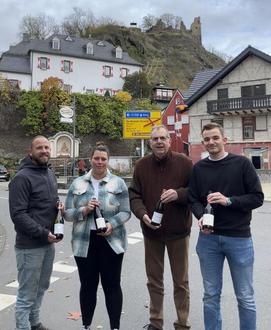 Lukas Sermann vom Weingut Sermann, die WG Mayschoß-Altenahr und der Vorsitzende des Förderkreis Georg Knieps, sowie der Geschäftsführer Julius Knieps freuen sich über den neuen Burgenwein.