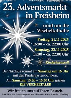 FREISHEIM. Am Freitag, den 21.11.2025 ab 16:00 Uhr und am Samstag, den 22.11.2025 ab 14:00 Uhr öffnet der Adventsmarkt in Freisheim seine Tore. Wie bereits in den vergangenen Jahren bieten Kunsthandwerker aus der Umgebung ihre Waren an. Für das leibliche Wohl sorgen die Essen- und Getränkestände aus der Gemeinde. Am Samstag spielen die Vischeltaler und die Kindergartenkinder führen einen Tanz auf. Um 16:00 Uhr kommt der Nikolaus. Herzlich willkommen!