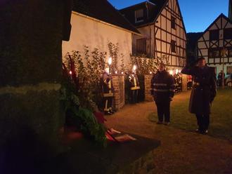 Von der Freiwilligen Feuerwehr, die die Gedenkfeier mit Fackeln stimmungsvoll gestaltete, trug Verena Kreuzberg ein Gedicht vor, welches sich mit der Sichtweise und den Erfahrungen von heute mit Krieg auseinandersetzte.