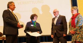 Noch sichtlich ergriffen nahmen zwei VertreterInnen des Vorstands der AG Historisches Ahrtal e.V.am 7. November den Preis stellvertretend für alle Akteure im und um den Verein entgegen. Die Silberne Halbkugel des Deutschen Preises für Denkmalschutz 2022 in der erstmals ausgelobten Kategorie “Vermittlung” würdigt das “mutige, schnelle, kompetente, professionelle, zugewandte, improvisationstalentierte, menschliche und tatkräftige Engagement bei der Denkmalvermittlung und der Hilfe zur Selbsthilfe”.