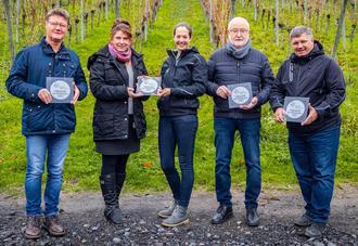 Mirja Düren (M.) vom Ahrtal-Tourismus übergibt Plaketten an: (v.l.) Richard Lindner, Ortsvorsteher Bad Neuenahr, Eva Flügge, Vorsitzende Verkehrsverein Altenahr, Klaus Kniel, Ortsvorsteher Heppingen, und Rüdiger Fuhrmann, Ortsbürgermeister Altenahr. Alle weiteren Weinorte entlang des Rotweinwanderweges erhalten die Plakette im Nachgang.
