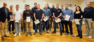 Bürgermeister Dominik Gieler (l.) und Wehrleiter Frank Linnarz (r.) freuten sich, 13 neue Kräfte für die Freiwillige Feuerwehr der Verbandgemeinde Altenahr begrüßen und verpflichten zu können.
