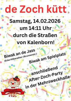 Die Straßensammlung (Kötttzoch) für den Karnevalszug findet am Freitag, 30.01.2026 ab 17:00 Uhr statt. Der gesamte Erlös wird an die Zugteilnehmer ausgezahlt. Das Festkomitee Kalenborner Karneval e. V. sucht noch ein Zugmotto bzw. Slogan. Vorschläge bitte schriftlich einreichen.