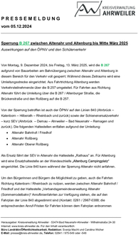 ALTENAHR / ALTENBURG. Bis Freitag 13. März 2025, wird die B 267 aufgrund von Bauarbeiten am Bahnübergang zwischen Altenahr und Altenburg in diesem Bereich für den Verkehr voll gesperrt. Während dieses Zeitraums wird eine Umleitungsstrecke eingerichtet. Aus Fahrtrichtung Altenburg werden Verkehrsteilnehmende über die B 257 umgeleitet. Für Fahrten aus Richtung Altenahr führt die Umleitung über die B 267 / Altenburger Straße, die Brückenstraße und den Roßberg auf die B 257.