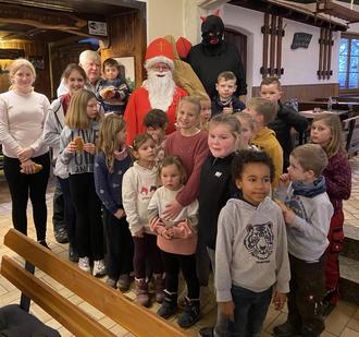 DERNAU. Am 9. Dezember trafen sich 20 junge Wanderstiefelchen mit ihren Eltern und Großeltern zur Nikolauswanderung hinauf zur Krausberghütte. In der mollig warmen Hütte hatten die Hüttenwirte für die Kinder heißen Früchtepunsch und die Erwachsenen leckeren Glühwein gemacht. Die Dernauer Gitarrengruppe spielte bekannte Weihnachtslieder zum Mitsingen. Draußen vor der Hütte loderte ein großes Feuer, das wärmte und seinen hellen Schein verbreitete. Dann – ein allgemeines Raunen: der Nikolaus kommt aus dem Wald! So schnell wie der Blitz waren alle Kinder wieder in der Hütte und bei ihren Eltern. Der Nikolaus in seiner roten Bischofstracht las in seinem großen goldenen Buch und wusste zu jedem Kind etwas zu sagen – bei den allermeisten natürlich nur Gutes! Zum Schluss bekam jedes Kind von Knecht Ruprecht einen Weckmann geschenkt und die Gitarrengruppe stimmte „Laßt uns froh und munter sein“ an, bevor der Nikolaus mit seinem Gehilfen wieder weiter zog.