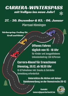 Mit Vollgas ins neue Jahr! Vom 27.12. bis 30.12. und vom 03.01. bis 06.01. steht im Pfarrsaal Hönningen eine große Carrera-Bahn bereit – offen für Kinder, Familien und alle Junggebliebenen. Täglich von 15:00 Uhr–18:00 Uhr für 1,50 € pro Person. Am 30.12. gibt es außerdem einen Carrera-Abend für Erwachsene (ab 18:30 Uhr, 10 € Anmeldung erforderlich). Wer das Angebot unterstützen möchte, kann für 10 € eine kleine Werbebande an der Strecke buchen.