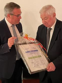 Horst Gies MdL (links), Vorsitzender des Fördervereins Krankenhaus Maria Hilf, überreichte seinem Vorgänger Dr. Gerhard Kreuter eine Urkunde, die ihn zum 1. Ehrenmitglied des Fördervereins ernennt.
