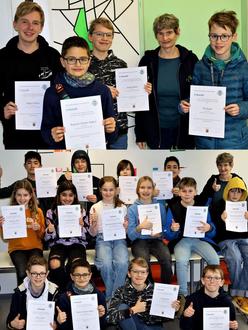 Fünf von ihnen gelang es so gut, dass sie sich als Preisträger der 2. Runde für die Landesrunde qualifizierten. Einen hervorragenden ersten Preis erreichten Jakob Findeisen (5b), der zu den drei drittbesten Fünftklässler*innen des gesamten Bundeslandes gehört, sowie Rafael Klein (8b), drittbester Achtklässler. Kayvan Dante Hafezi (6b) und Till Kulla (8b) erhielten einen 2. Preis, Julian Klein (6c) einen 3. Preis. Die betreuende Lehrerin Sigrid Eberle gratulierte allen Olympionik*innen.