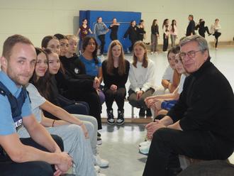 Geschult im Umgang mit Konfliktsituationen – Die Mädchen der 8. Klassen sprechen mit Gerd Mainzer vom Weißen Ring (rechts) und dem Polizisten Christian Rosenek, während im Hintergrund Selbstverteidigungsstrategien mit Thomas Statz erlernt werden