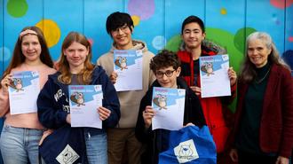 Die betreuende Lehrerin Elke Ritzert gratuliert den Schüler*innen, die mit einem ersten oder zweiten Preis ausgezeichnet wurden