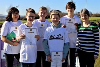 In der Landesgruppe Baden-Württemberg, Rheinland-Pfalz, Saarland erreichte das Team „Namenlos“ der Klasse 8b einen beachtlichen fünften Platz von 88 Teams dieser Jahrgangsstufe. Neben den glücklichen Preisträgern Rafael Klein, Till Kulla, Alexander Schmidt-Nechl und Nicolas Wein wurden ebenfalls ihre Mathematiklehrerin Iris Radtke-Haarkamp sowie die Differenzierungslehrerin Claudia Perser geehrt.