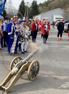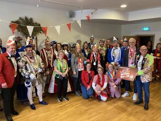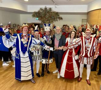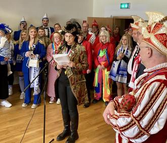 KALENBORN.OC. Zum diesjährigen Sturm auf das Rathaus der Verbandsgemeinde Altenahr hatte Dominik Gieler, Verbandsgemeindebürgermeister, am Freitag, den 17. Februar 2023, alle karnevalistischen Vereinigungen der VG Altenahr eingeladen – aufgrund der knappen räumlichen Gegebenheiten jedoch nur Abordnungen. Der dennoch großen Zahl an Jecken hatte der nach eigenen Aussagen „karnevalistisch unerfahrene“ Gieler nur wenig entgegenzusetzen und gab schließlich mit den Worten „Legt los, bevor ich’s mir anders überleg!“ den Schlüssel für das Rathaus an das Hönninger Prinzenpaar Prinzessin Geli (I.) und Prinz Dieter (I.) sowie das Freisheimer Dreigestirn Prinz Markus (I.), Jungfrau Patricia und Bauer Tim. Der ausrichtende Verein KG Rot-Weiß Hönningen sorgte erwartungsgemäß für ein sensationelles Programm – hatte man doch den diesjährigen Ahrtalgardemeister, die Tanzgruppe der Prinzengarde Hönningen, im Gepäck, der in dem provisorischen Ratssaal schnell an die räumlichen Grenzen (Decke) stieß. Ebenfalls mit dabei waren das bekannte und beliebte Rednerduo „Der Een on der Anne“ sowie die Königin der Büttenreden im Ahrtal, Elfi Pauly. Mutig nahm sie die Verantwortlichen der Flutkatastrophe in die Mangel, hierbei bekamen auch ehemalige Mitglieder befreundeter Karnevalsvereine aus den umliegenden Dörfern ihr Fett weg. Glücklich der Verein, der solch hochkarätige karnevalistische Besetzung in den eigenen Reihen hat! Gieler hatte wie versprochen für Speis und Trank gesorgt und so standen die Karnevalisten gemütlich schunkelnd bis in den frühen Nachmittag beisammen.