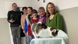 Unkompliziert und mit Freude wurden die Aufnahmen erstellt. Der Ausstrahlungstermin ist für Palmsonntag, 2. April 2023, 18 Uhr, WDR-Fernsehen, vorgesehen. Auf dem Foto von links: Kameramann Christian Hennicke, Andrea Morche, Daniela Spies-Rübsamen, Karin Rother, Amneris Bürschel und Regisseurin/Produzentin Elaine Schnee mit „Starkatze Mia“.