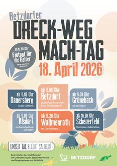 Am 18.04.2026 heißt es wieder: Ärmel hochkrempeln und anpacken! Die Stadt Betzdorf lädt gemeinsam mit den Ortsgemeinden Alsdorf, Dauersberg, Grünebach, Scheuerfeld und Wallmenroth zum großen Dreck-weg-mach-Tag ein.